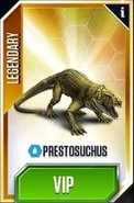 Prestosuchus is a legendary non-hybrid amphibian that can be created in Jurassic World: The Game, even though in real life it was a terristrial reptile. It can only be obtained by joining a VIP Membership. When Prestosuchus is in its pen, its tail rests on the ground. While other crocodiles did this, it is unlikely Prestosuchus did this. With the legs under its hips like a dinosaur and unlike a semi aquatic crocodile, the tail of Prestosuchus had to be above the ground for balance.