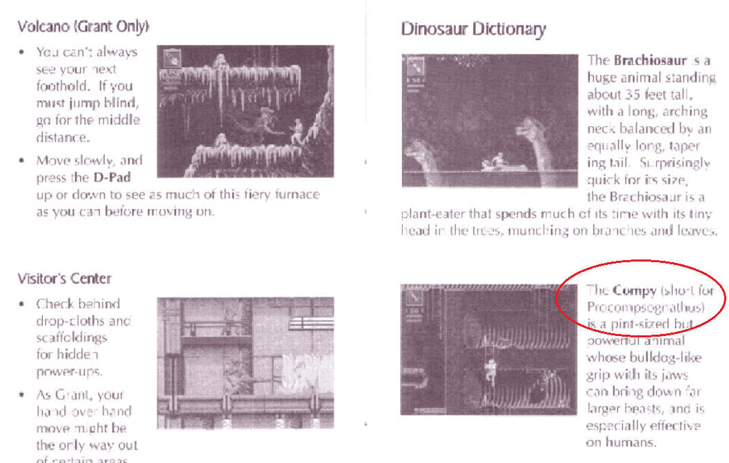 Procompsognathus appears in the game and its Rampage Edition counterpart as a minor enemy in most stages.[1] Appearing in groups of 2-5, they are fragile and easy to defeat but highly aggressive when approached, where they leap and cling to Alan, blocking any attacks and biting until they're dislodged by tapping B.