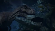 Even though Jess caught a ledge preventing her falling to her death, she soon lost her grip and fell further down, now hanging onto the door frame. Dr. Harding came down from the roof to help her though soon the Tyrannosaur charged through the doors knocking Dr. Harding back. The predator then tried to kill Jessica as she dangled from the door frame. As Dr. Harding grabbed his tranquilizer gun, Jessica finally lost balance and landed on the top of the head of the T. rex, which prompted the Tyrannosaur to shake Jess off her head. Nima, fully recovered now, tossed the tranq darts to Dr. Harding who shot the Tyrannosaurus in the face three times, saving Jess from potentially being eaten. However, the T. rex's retaliation was quick and she soon charged through the door frame, destroying it. She then proceed to attack the tour vehicle that the Hardings were behind using as shelter. The Tyrannosaur's attack on the Harding finally came to an end when Dr. Harding told Dr. Sorkin to start the tour vehicle, which distracted the T. rex.[4]