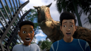 The boys explore the enclosure for a while before Kenji throws a rock and hits the fence. Darius cautiously asks Kenji if they are on the safe side of the enclosure, the Carnotaurus soon appears and the both boys realize they are on the wrong side of the fence.