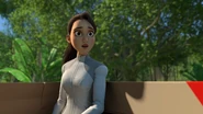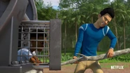 The Carnotaurus chases Kenji and Darius through the jungle. The boys attempt to escape through a small cage inside the Carnotaurus enclosure. During the escape the cage door shuts, trapping Darius between the cage door and the approaching Carnotaurus. Soon after Kenji saves Darius' life by managing to pry open the cage door using a tree branch. The two then mock Toro, the Carnotaurus; which proceeds to ram the gates of it's enclosure, receiving a scar across it's muzzle.