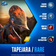 Tapejara appears in Jurassic World: The Game as a rare non-hybrid pterosaur and costs 670 DNA after being hatched for the first time. In Jurassic World: The Game, Tapejara had teeth in its beak while it had no teeth in reality. Like in Jurassic Park: Builder, it seems to be based off of Tupandactylus (although a different species, Tupandactylus imperator instead of Tupandactylus navigans), which also had no teeth in reality.