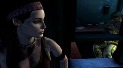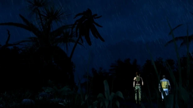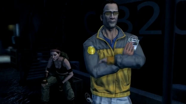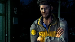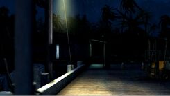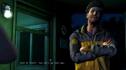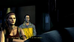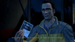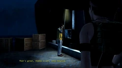 Miles Chadwick is on the East Dock, he is talking to Lewis Dodgson on the phone. Miles is waiting for Dennis Nedry to meet him on the docks, but it seems like Miles has a "Plan B" waiting for him to give the orders. Miles still talking to Dodgson is stating that Dennis would never double cross them as the money is too good, also assuring Dodgson that "she" Nima Cruz - Plan B - doesn't know anything she doesn't need to know. Miles then says to Nima that he's "got Dodgson here", although Nima is not giving a care in the world who Miles is talking to. Miles then hangs the phone and tells Nima that his contact is going to be at the docks any minute. Nima then asks how long they will be waiting for Miles' contact. Miles then says that "it might be awhile" as he looks at a tracking device he says that his contact is not close to the docks. Nima then sees that Miles is wearing an InGen jacket and asks him if InGen knows he stole it. Miles then responds, that he needs to blend in. Miles holding a photo of the Barbasol canister shows Nima that this "shaving cream" is what's going to make both of them rich, and what they are here to collect. Nima then states, that the "shaving cream: have a time