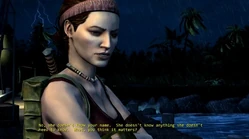 them. The guard then asks why Nima is carrying a machete. Nima then says that the machete is a good all purpose "tool" for cutting, pounding etc. The voice from the speakers again warns that all personnel must be on the boat NOW, including Barney - the guard. Barney then asks if Miles vouch for her - Nima. Miles then ignorantly agree, the guard then tells them to "move your butts", Miles then tells Nima that next time "he will do the talking". The two then enter the island.