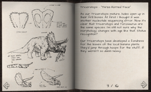 As Jurassic park's clones matured they would develop larger, more elongated frills as well as holes in these said frills. Dr. Laura Sorkin discovered this metamorphosis and wrote her finds in her journal, providing that Triceratops was the same as the related Torosaurus.[1]