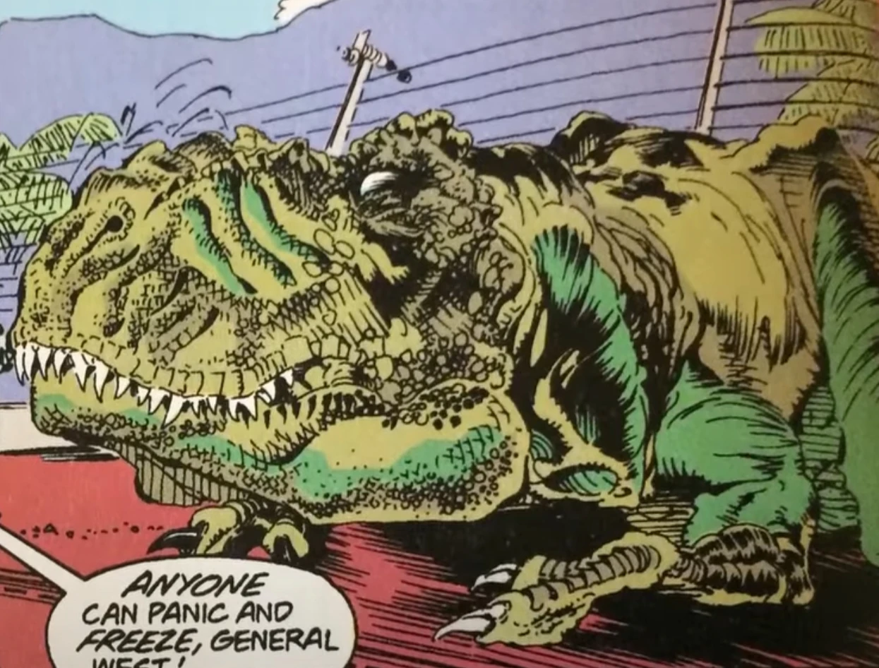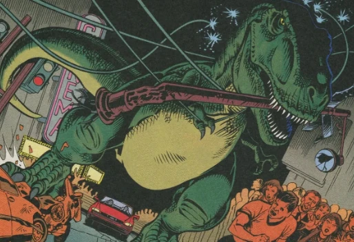 - The iconic roaring dinosaur surrounded by a falling banner scene does not happen in the comics.