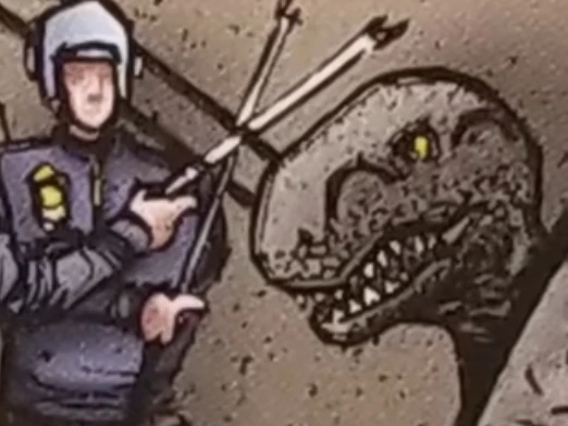 In the first comic of the series, Alan Grant and Ellie Sattler watch as the T. rex confronts and battles several military grade equipment, including tanks, before it is captured and subdued by the American military. Grand advocates for use of a stimulant for the dinosaur as they have are the overdosed the tranquilizer needed. Soldiers come and chain Rexy up to drag her back to her paddock.