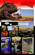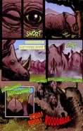 A herd of white rhinoceroses (with rhinoceros incorrectly labeled rhinocerous on that page) appeared in issue 2, living in the Fossil Rim Wildlife Preserve near Glen Rose, Texas. According to the comic, this species has become endangered and on the brink of extinction. The herd sensed something in the bushes and charged forth to investigate, only to run in the opposite direction when it was revealed to be a Carnotaurus.